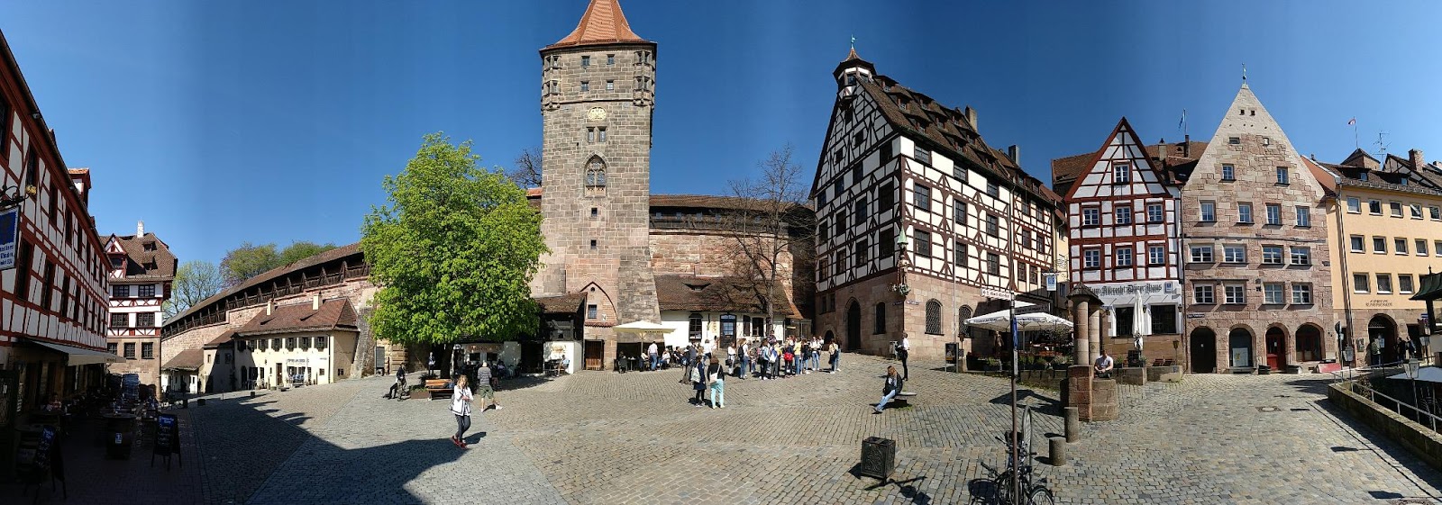 Esta panorámica está tomada en una de las entradas a la zona del castillo, cuya puerta se intuye bajo el árbol a la izquierda, es una zona con cervecería y restaurantes y muy animada, incluso por la noche como pudimos comprobar el otro día. Descubrimos con asombro que Nuremberg es la cuna de muchas marcas conocidas como Faber Castell, Staedler, Stabilo o Siemens, lo que da idea de la capacidad productiva y de empleo de esta ciudad.